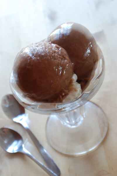Sirve este helado cremoso de chocolate en copas, en forma de bolas, adornando a gusto con nata montada.